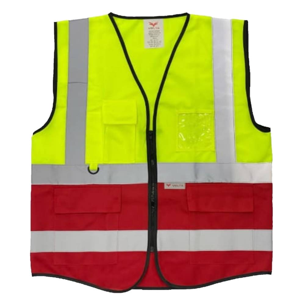 سترة السلامه المهنية اللون أصفر وأحمر السترة التي تجمع بين اللونين الأصفر والاحمر تجمع بين فوائد كلا اللونين: 1. الرؤية العالية: وجود اللون الأصفر (أو الأصفر الفسفوري) يضمن أن مرتديها واضح وظاهر للعيان، مما يزيد من سلامته. 2. التعريف بالوظيفة: وجود اللون الأحمر (غالبًا على شكل شرائط أو أقسام) يساعد في تحديد هوية مرتديها أو دوره. على سبيل المثال: o قد تكون سترة مشرف موقع بناء: حيث يعزز الاحمر من كونه مشرفًا، بينما يضمن الأصفر سلامته بين المعدات والعمال. o سترة عامل في المطار: حيث يحتاج إلى أن يكون مرئيًا (أصفر) ولكن لونه الرسمي أو تعريف فريقه هو الاحمر. o سترة شرطي مرور أو أمن: للحصول على رؤية عالية مع الاحتفاظ بالهوية المؤسسية المواصفات القياسية المهمة بغض النظر عن اللون، يجب أن تفي السترات بمعايير السلامة لضمان فعاليتها. • المواد العاكسة (Reflective Tape): يجب أن تحتوي على شرائط عاكسة (غالبًا فضية أو بيضاء) تعكس ضوء المصابيح الأمامية للسيارات في الليل