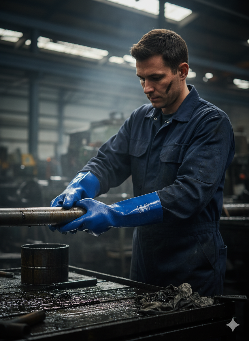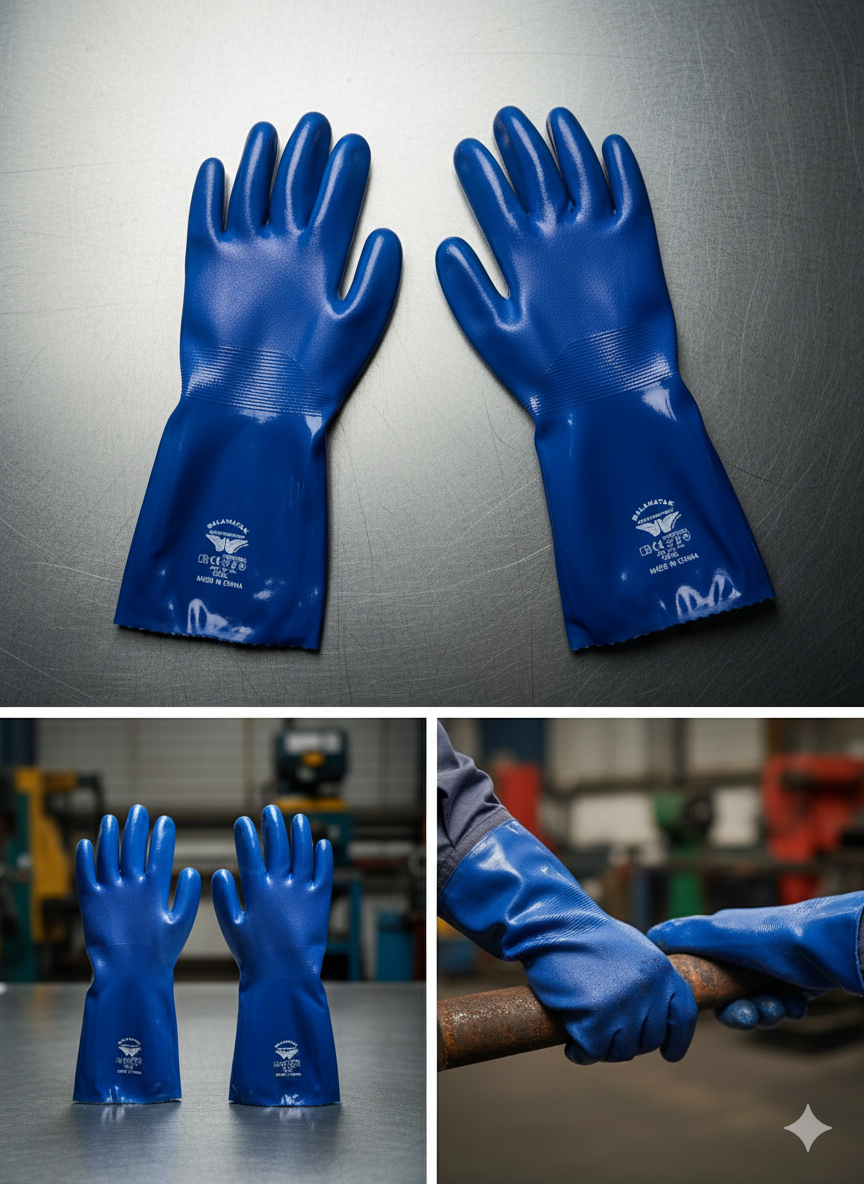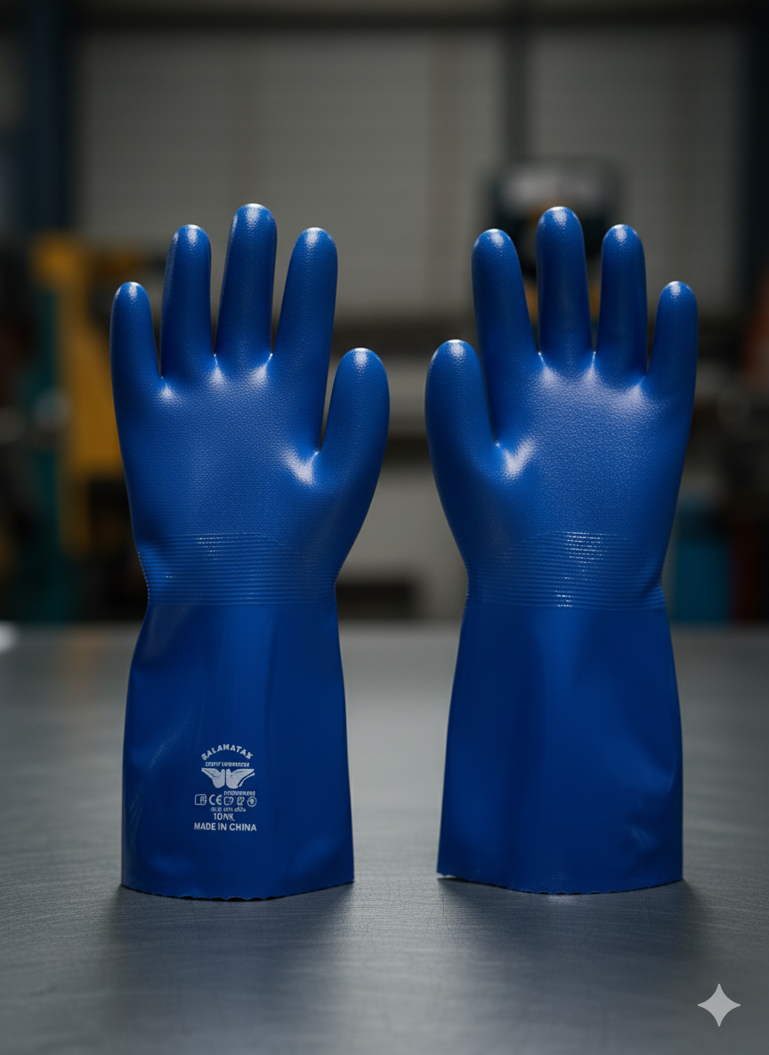 قفازات الحماية الزرقاء: قوة ومتانة لا تُضاهى في بيئات العمل الصعبة ارتقِ بمستوى الأمان والحماية في موقع عملك مع قفازاتنا الزرقاء عالية الأداء والمصممة خصيصاً لتحمل أقسى الظروف. هذه القفازات هي خيارك الأمثل للعمل في البيئات الصناعية التي تتطلب مقاومة فائقة للمواد الكيميائية والسوائل الضارة. الميزات الأساسية: حماية كيميائية متكاملة: صُنعت هذه القفازات من مادة متينة توفر حاجزاً قوياً ضد مجموعة واسعة من الزيوت، الشحوم، المواد البترولية، والمواد الكيميائية، مما يحافظ على سلامة جلد يديك بشكل فعال. تصميم مريح وقبضة محكمة: على الرغم من قوتها، تتميز القفازات بتصميم يوفر مرونة عالية وحساسية لمسية جيدة، مما يسهل التعامل مع الأدوات والمعدات بدقة. كما أن نسيجها يضمن قبضة محكمة حتى عند التعامل مع الأسطح الرطبة أو الدهنية. متانة وعمر طويل: تمتاز هذه القفازات بمقاومة عالية للتآكل والثقوب، مما يضمن استخداماً طويلاً وموثوقاً ويوفر لك تكلفة استبدال متكرر. طول إضافي للحماية: يمتد طول القفاز لتوفير حماية إضافية للمعصم وجزء من الساعد ضد الرذاذ والتعرض المباشر للسوائل.