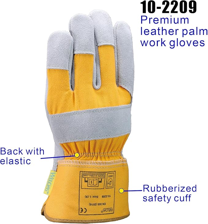 ويلداس® قفازات عمل من الجلد الفاخر، متعددة الاستخدامات بقطع الابهام والبندقية، مصنوعة من المطاط شديد التحمل بطول 7.5 سم، اصفر أمان مطاطي شديد التحمل بطول 7.5 سم لمزيد من الحماية. الجزء الخلفي مزود بحزام للمفاصل لمزيد من الأمان والمتانة. تصميم متعدد الاستخدامات للإبهام والمسدس يوفر حركة طبيعية للإبهام والأصابع للاستخدامات العامة. راحة اليد مبطنة بقطن صوفي بنسبة 100% لمزيد من الراحة، ماصة للعرق ومقاومة للحرارة. ظهر القفازات مصنوع من قطن التويل المرن مما يوفر ملاءمة مريحة وتهوية بخار العرق. المقاسات المتاحة: الجزء #10-2209L = L، (راجع جدول المقاسات أعلاه 9)؛ الجزء #10-2209XL = كبير جدًا (راجع جدول المقاسات أعلاه 9 1/2) الشهادة والمطابقة: EN 388:2016/A1:2018, UE-000104/00.