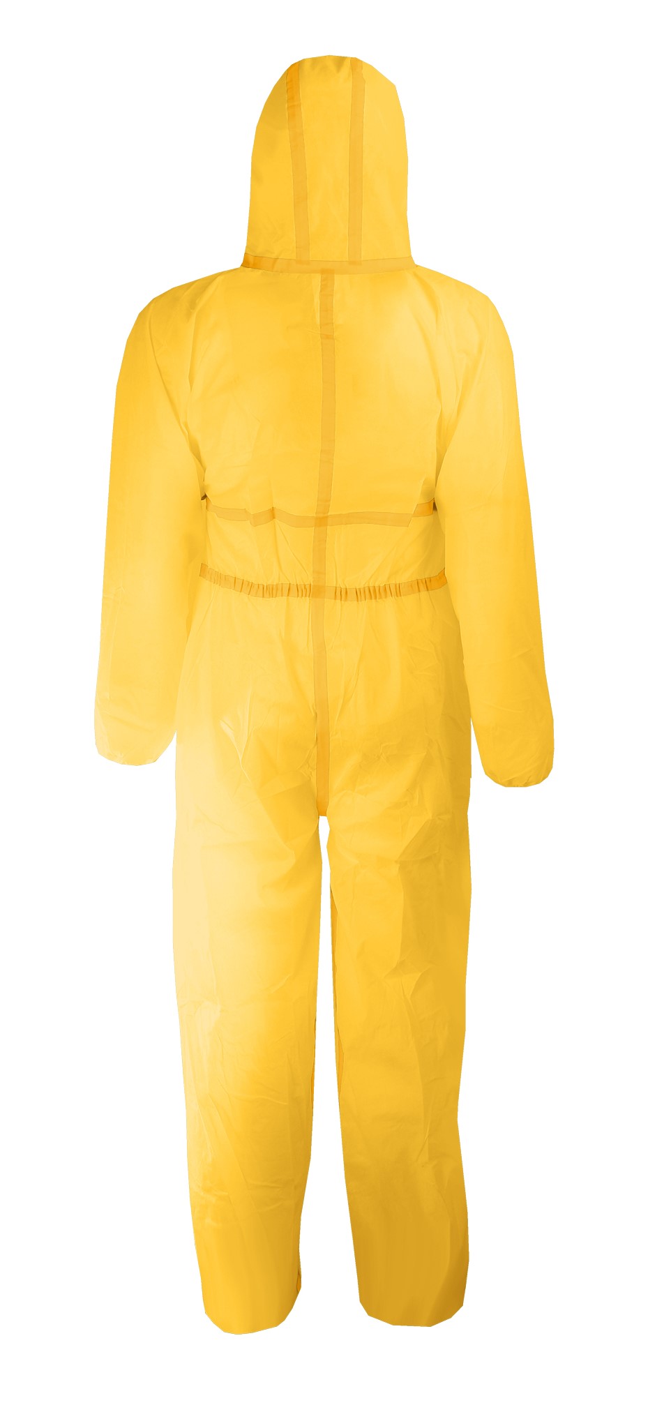 المادة: 100٪ بولي بروبيلين مع فيلم بوليثيلين (70 جم/م²). مسامي دقيق، مقاوم للماء. درزات مقاومة للماء بشريط لاصق حراري. غطاء رأس من 3 قطع. إغلاق بسحاب تحت شريط لاصق ذاتي. شدات مرنة (الخصر، الغطاء، المعصمين والكاحلين). حلقات للإبهام. اللون: أصفر. الحماية المتعددة المخاطر بفضل المادة (مسامية دقيقة، مقاومة للماء): حظر الجسيمات الصلبة والسائلة، والرشاشات والسوائل، والوكائل المعدية والتلوث الإشعاعي + خصائص مضادة للكهرباء الساكنة. مقاومة للماء بفضل فيلم البولي إثيلين والخياطات الملصوقة بشريط لاصق حراري. ضبط سريع وسهل بفضل شدّات مرنة. كيس بولي بسهم يوروي لتعليق يسمح بالعرض السهل في المتاجر المهنية.